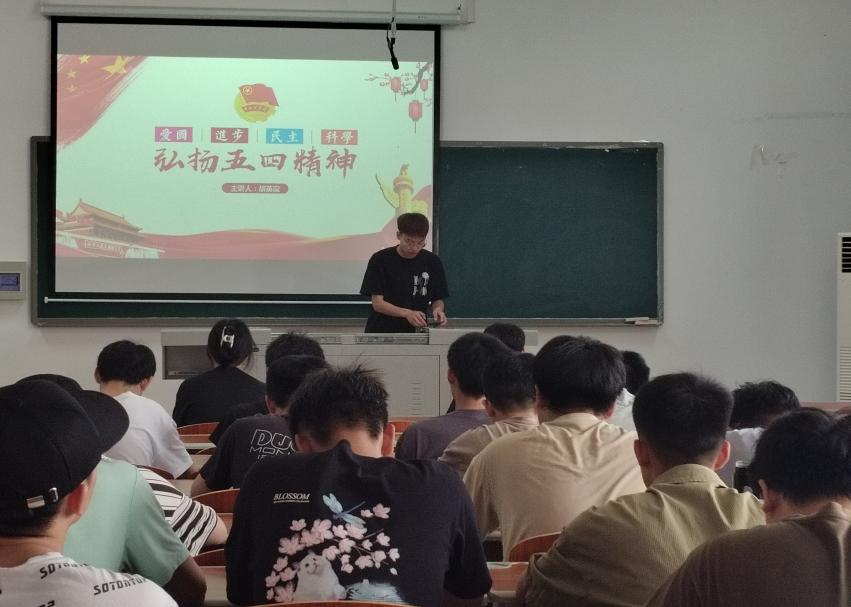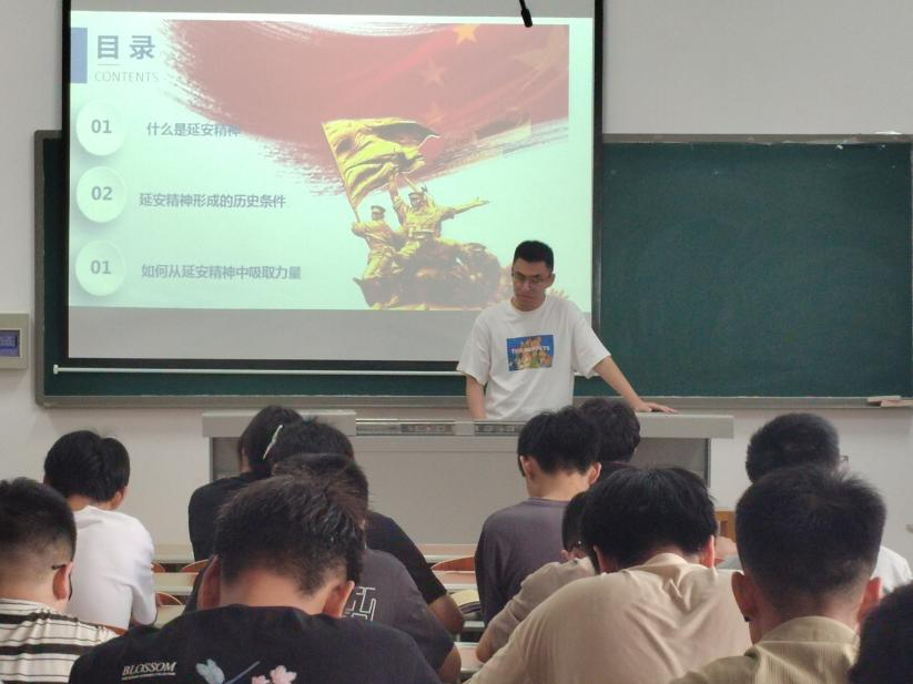 学生党员赵一韩从延安精神形成的历史条件、延安精神的原生形态和主要内容、延安精神的时代价值和让延安精神放射出新的时代光芒四个部分为同学们逐一讲解。讲述了以毛泽东同志为代表的中国共产党人在延安时期的特殊历史阶段,在争取民族独立和人民解放事业的伟大斗争实践中,培养、形成和发展起来这一崇高革命精神和优良革命传统。学生党员胡英豪以“传承五四薪火 谱写青春华章”为主题,讲解“五四运动”的历史意义、时代意义及如何传承五四精神,号召大家作为青年人应当有理想,有本领,有担当,要传承发扬五四精神,落实五四精神,不能只停留在口号上。要学习五四精神,做一位进步爱国青年,勇于创造,甘于奉献。