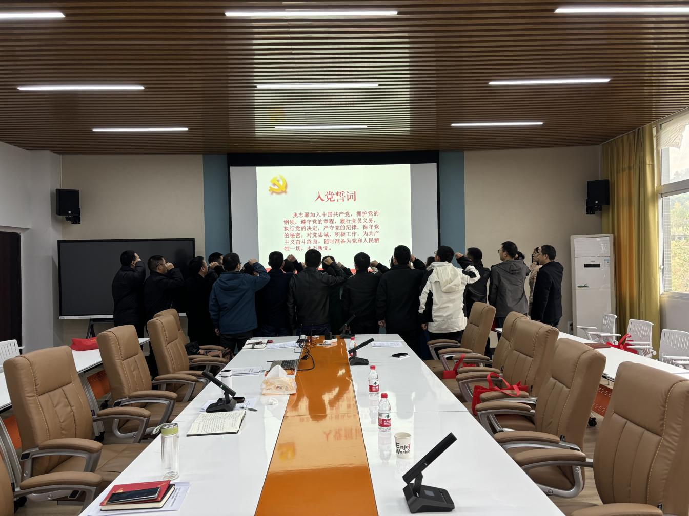 全体党员重温入党誓词,高举右拳,庄严宣誓:“我志愿加入中国共产党,拥护党的纲领,遵守党的章程……”。铮铮誓词、字字千钧,时刻提醒着每位党员不忘初心,进一步坚定忠诚履职尽责、服务学生的决心。