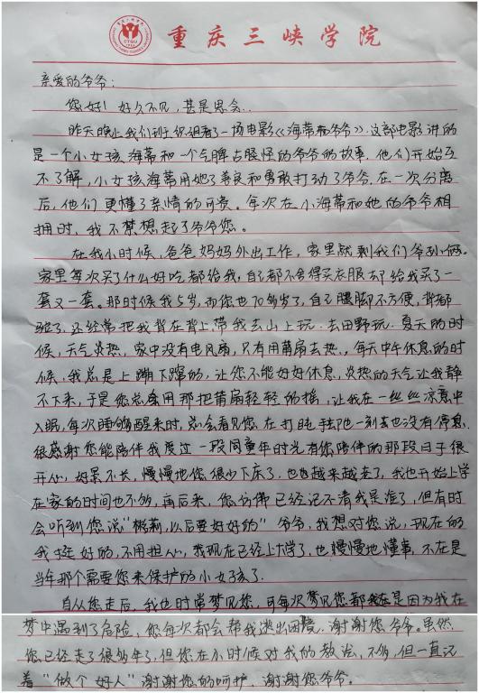 九九重阳凝聚了中华民族千秋万代“老吾老”的浓浓深情和生生不息的民族风范。为弘扬中华民族尊老、敬老、爱老的传统美德,10月7日,9728太阳集团团总支举办了“孝似朝阳•信在重阳”的主题观影活动,2019级全体同学观看了电影《海蒂与爷爷》并写信给自己最思恋的长辈。