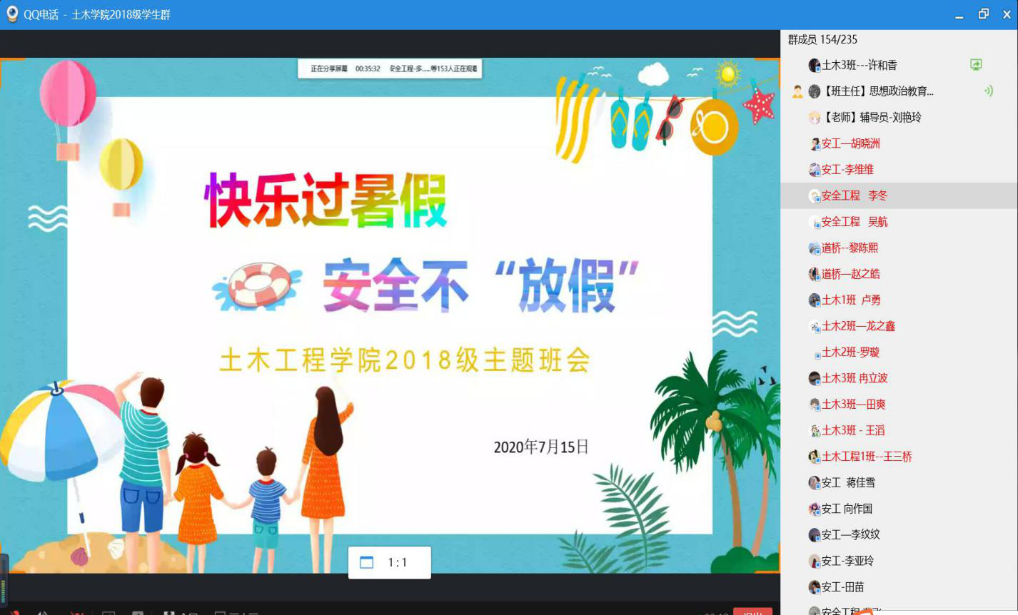 为进一步增强学生安全意识,提高安全防范能力,帮助大学生度过一个安全、愉快的暑期,7月15日晚,9728太阳集团2018级全体学生参加了安全教育主题视频会议。会议由2018级辅导员刘艳玲主持,学院党总支副书记张小梅参加会议并强调暑期安全,2018级全体学生参加会议。