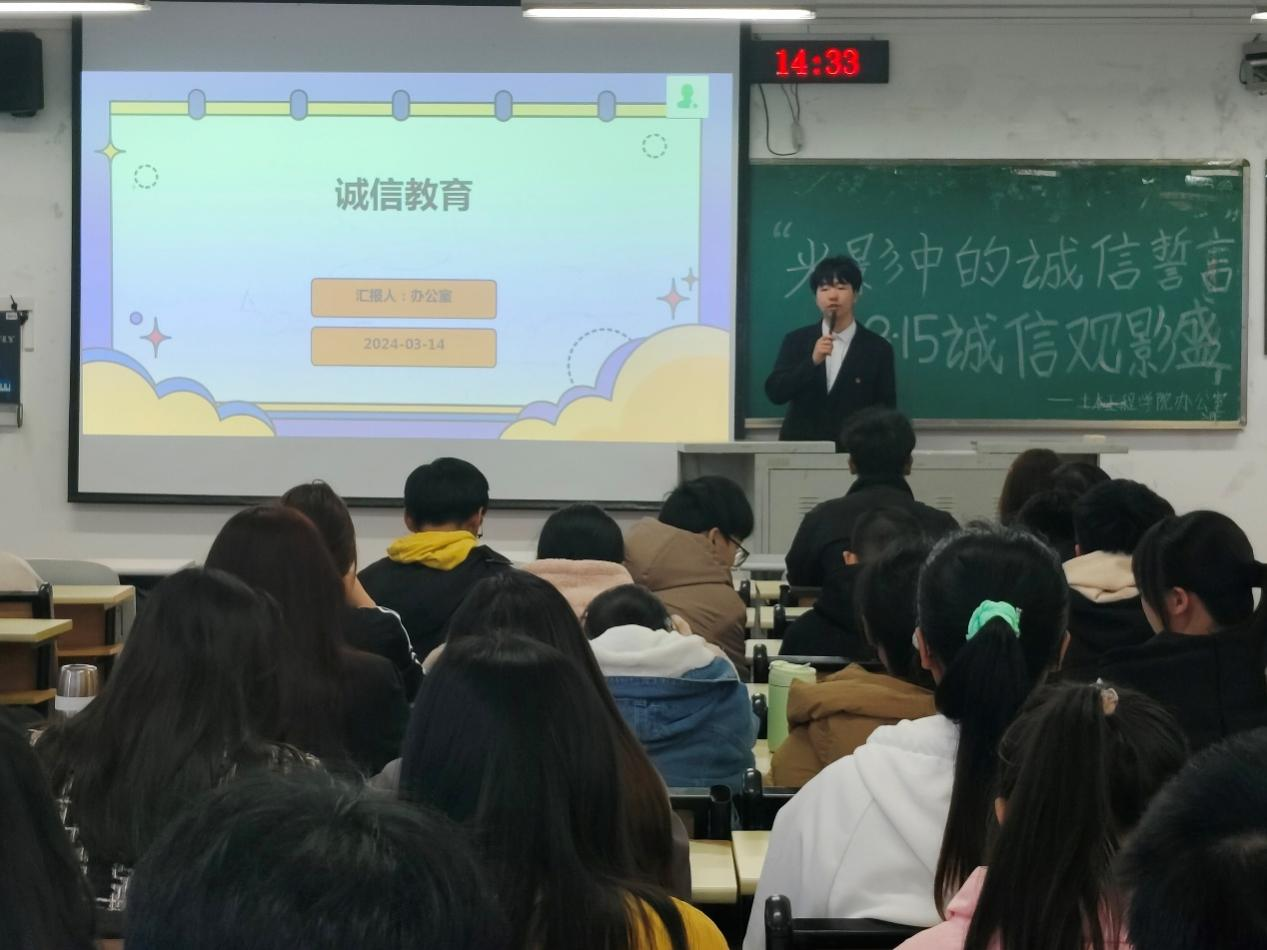 为了增强同学们的诚信意识和防诈骗意识,培养良好的道德风尚,3月14日下午,9728太阳集团于明辨2栋301组织近百名同学开展了“光影中的诚信誓言——3·15诚信观影”活动。