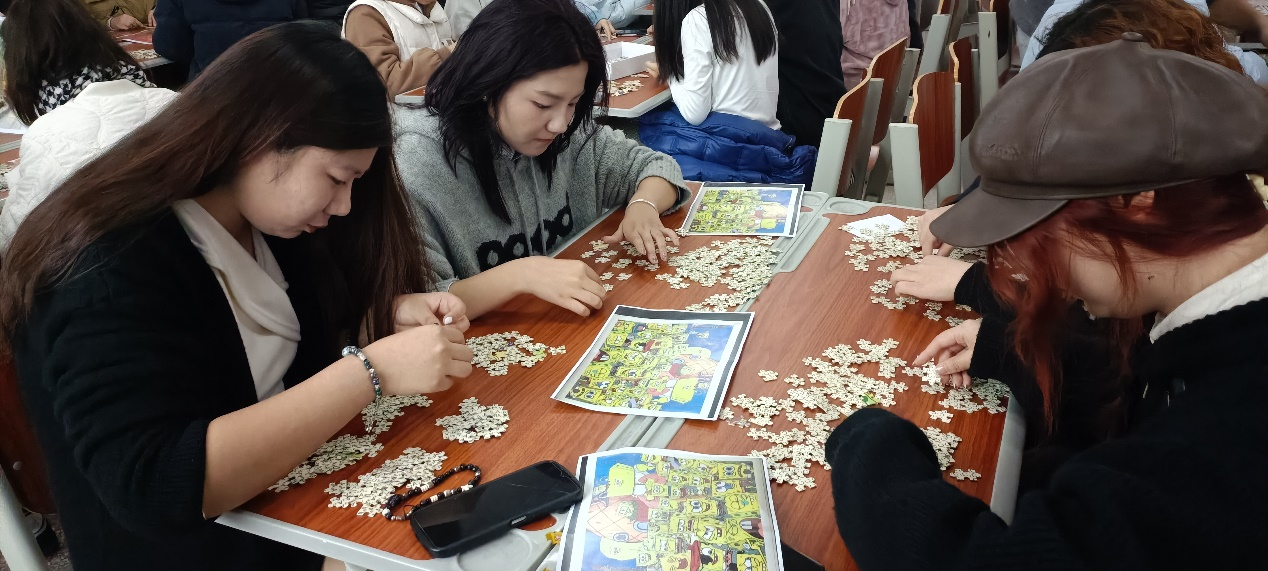 活动伊始,主持人向同学们介绍拼图大赛规则与计时标准。紧接着一声令下,倒计时开始,各参赛小团队开启默契配合模式,团队成员分工合作、井然有序、各展所长。有的负责分片和找纯色,有的全程对图+局部定位,有的负责边框和局部残缺补位。现场你追我赶的气氛浓烈,小小方桌上上演的不仅是一场比赛,还蕴含合作、协调和统筹的能力。