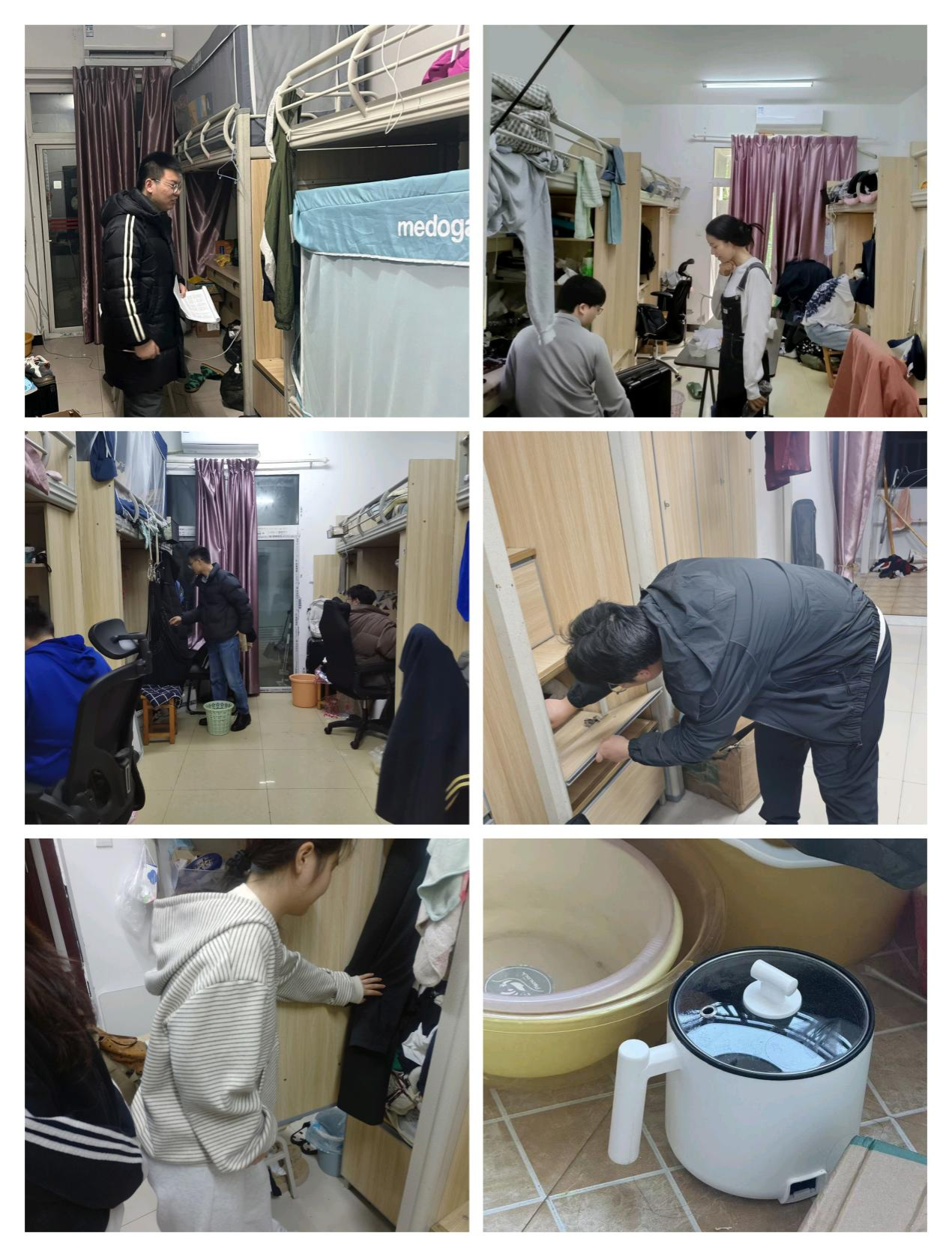 本次排查覆盖学院全部宿舍,重点检查违规电器、乱拉电线、消防通道堵塞等安全隐患。检查发现,大部分宿舍安全状况良好,但仍在部分宿舍中发现存在安全隐患,主要包括人离宿舍未断电、接线板放置不当、通道堆放杂物等问题。并查处学生使用大功率电器、私拉乱接电线2起。针对发现的问题,检查人员现场督促立即整改,并对学生进行了安全教育。
