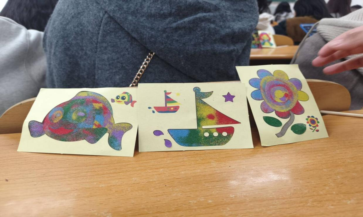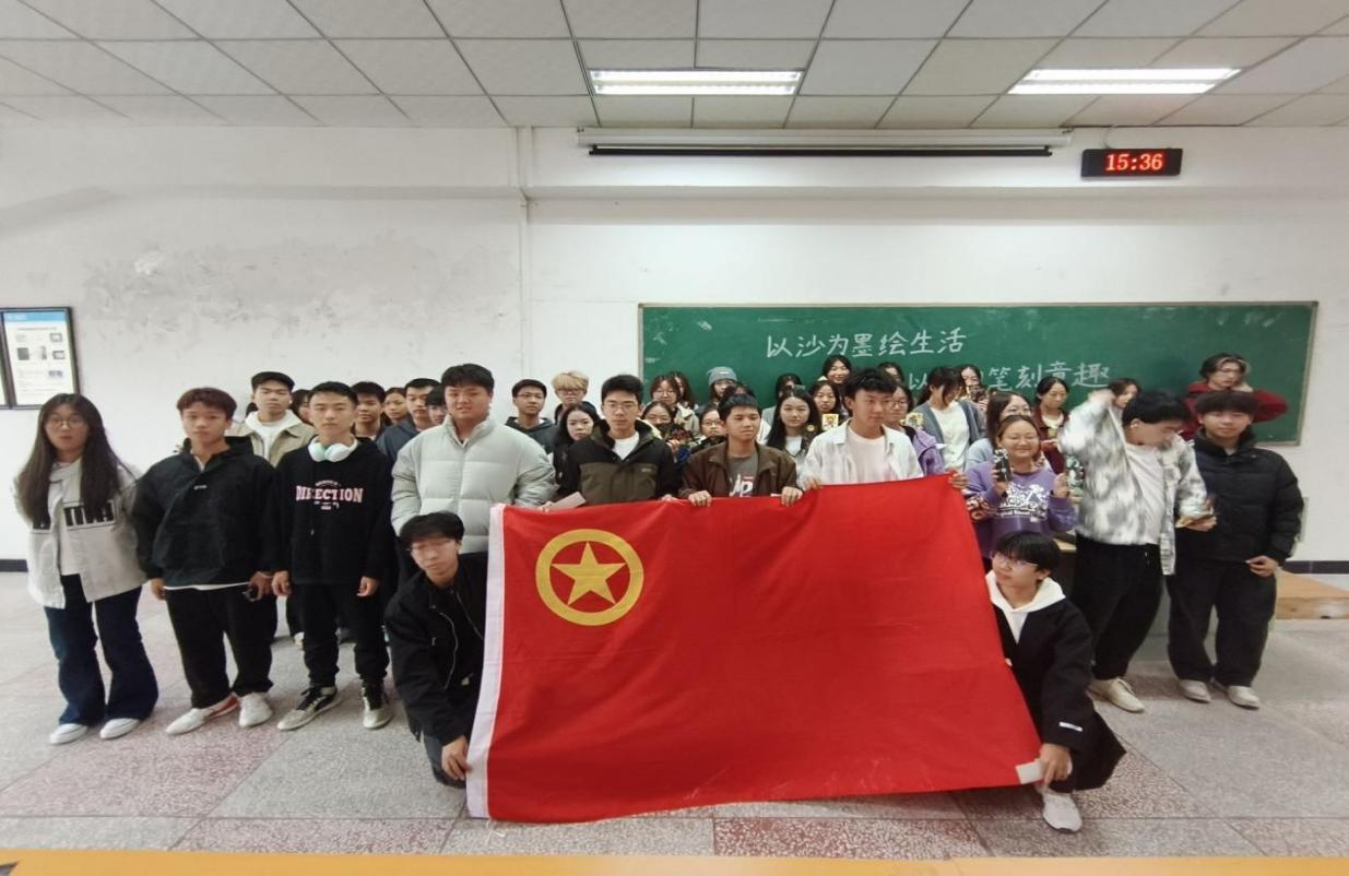 本次活动面向全院学生,以“将绘画融入生活,让热爱填满画卷”为主题。现场准备了彩沙、画框、刮板等多种创作工具,供同学们自由发挥,创作属于自己的独特作品。活动过程中,工作人员有序分发绘图工具,同学们积极领取材料,投入沉浸式创作,体验沙画艺术的魅力与分享的喜悦。一幅幅生动有趣的作品,将秋日的欢愉定格于画板,留存于纸间。活动最后,全体参与成员进行了作品展示与合影留念。