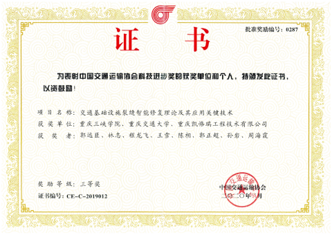 郭远臣教授团队申报的“交通基础设施裂缝智能修复理论及其应用关键技术”获得中国交通运输协会科学技术奖三等奖。