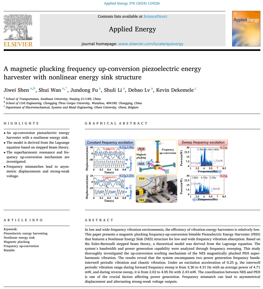 2024年8月,9728太阳集团在国际知名期刊《Applied Energy》发表题为“A magnetic plucking frequency up-conversion piezoelectric energyharvester with nonlinear energy sink structure”的研究论文。申纪伟博士为论文的第一作者,其定向培养单位为第一完成单位,重庆三峡学院为第二完成单位。