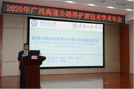 12月7日,我院工程结构减灾与安全团队陈相老师参加了2020年广西高速公路养护新技术学术年会,并在会上作了《隧道衬砌结构预养护决策与快速修复技术》的学术报告,报告分别从研究背景与意义、公路隧道预养护决策与技术、非结构性裂缝自愈合处治材料、早强高性能复合材料加固结构裂缝、不中断交通隧道多功能作业平台五个方面对隧道衬砌结构预养护决策与快速修复技术做了详细汇报。