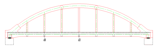 系杆及横梁:系杆采用预应力钢筋混凝土结构,其截面为矩形实体截面,高90cm,宽80cm。全桥共设9道钢筋混凝土横梁,其中有2道端横梁、7道中横梁(吊杆处横梁)。