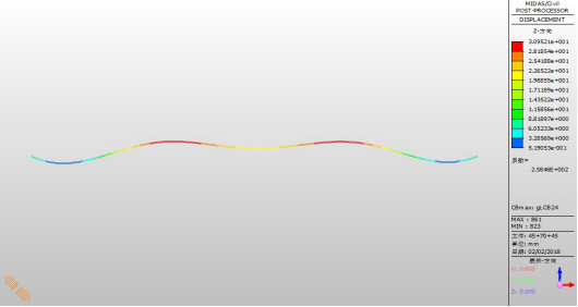 (一)按D64规范,静活载作用下最大竖向挠度为66mm,采用不计冲击力的汽车车道荷载的频遇值,频遇值系数取1.0。66/70000=1/1060<1/500,满足规范要求。正负挠度绝对值之和为42mm,42/75000=1/1785<1/500,满足规范要求。