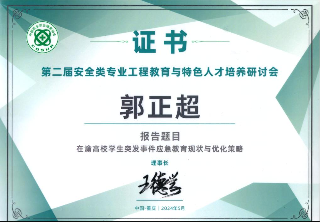 此次研讨会为期两天,采用特邀主题报告与平行分会场报告的形式,我院安全工程教师郭正超受邀做题为“在渝高校学生突发事件应急教育现状与优化策略”的分会场报告,介绍了我校学生突发事件应急教育情况,同与会专家一起探讨高校学生应急教育,受到与会专家的热烈关注与一致好评。